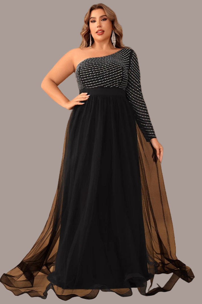 Rechiely Collection – Make a statement in this plus-size one-sleeve evening dress. Designed with a stylish single sleeve and delicate mesh patchwork, it combines elegance with modern fashion. The gown sparkles with hot diamond accents, adding just the right amount of shine. The fitted design flatters your curves, making it perfect for prom, weddings, birthday parties, and formal evening events.